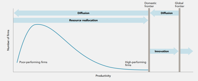 Low productivity has long been a challenge for New Zealand. The Productivity Commission’s Frontier Firms report provides a useful framework for understanding productivity distribution within sectors. A small group of high-performing firms sits close to the global frontier, while others lag behind both the domestic and international leaders. This gap matters because improvements at the frontier can influence the rest of the economy.