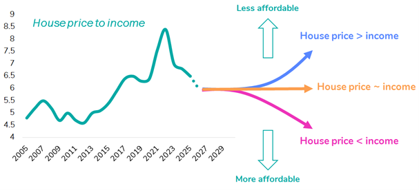 Looking further ahead to New Zealand’s economic model, the obvious ensuing question that captures the essence of longer-term strategy and planning is – what should housing affordability look like in five, ten, and twenty-five years’ time?