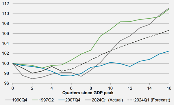 Lower interest rates and mortgage rollovers are expected to drive economic recovery in coming months. As outlined above, it is sensible to temper expectations as to whether households will have the confidence to spend their higher disposable income resulting from lower interest rates. Some will understandably maintain a level of caution, or rebuild their financial buffers, in the face of still mid-four percent mortgage rates and limited wealth effect from house price inflation.