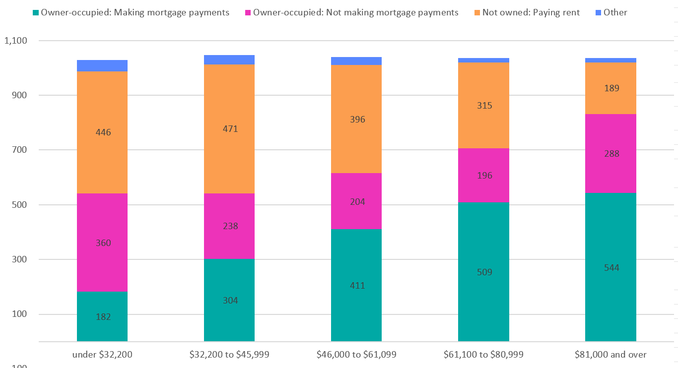 About a third of people in the lowest disposable income group own their property but do not pay mortgages. It is likely that retirees make up a sizeable proportion of this group, although breakdown by age data is not readily available. In fact, more than 80 percent of those with a disposable income of less than $32,200 are either renting (446,000), and therefore potentially sharing the cost of rates with landlords, or are mortgage-free owner-occupiers (360,000).